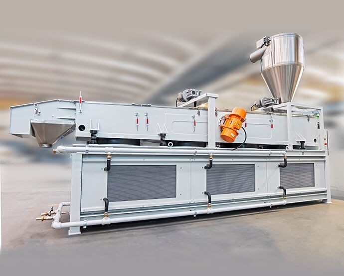 Granule cooling is carried out on holed stainless steel sheet surfaces through a forced air circulation generated by vertical flow valves, fitted in the machine base. Wall-mounted filters, fitted outside the base, ensure an air flow with no contamination. The alternating movement of the surfaces is generated by proper counter-rotating mass vibrators, allowing a uniform distribution of granules, with subsequent optimisation of the useful cooling surface.